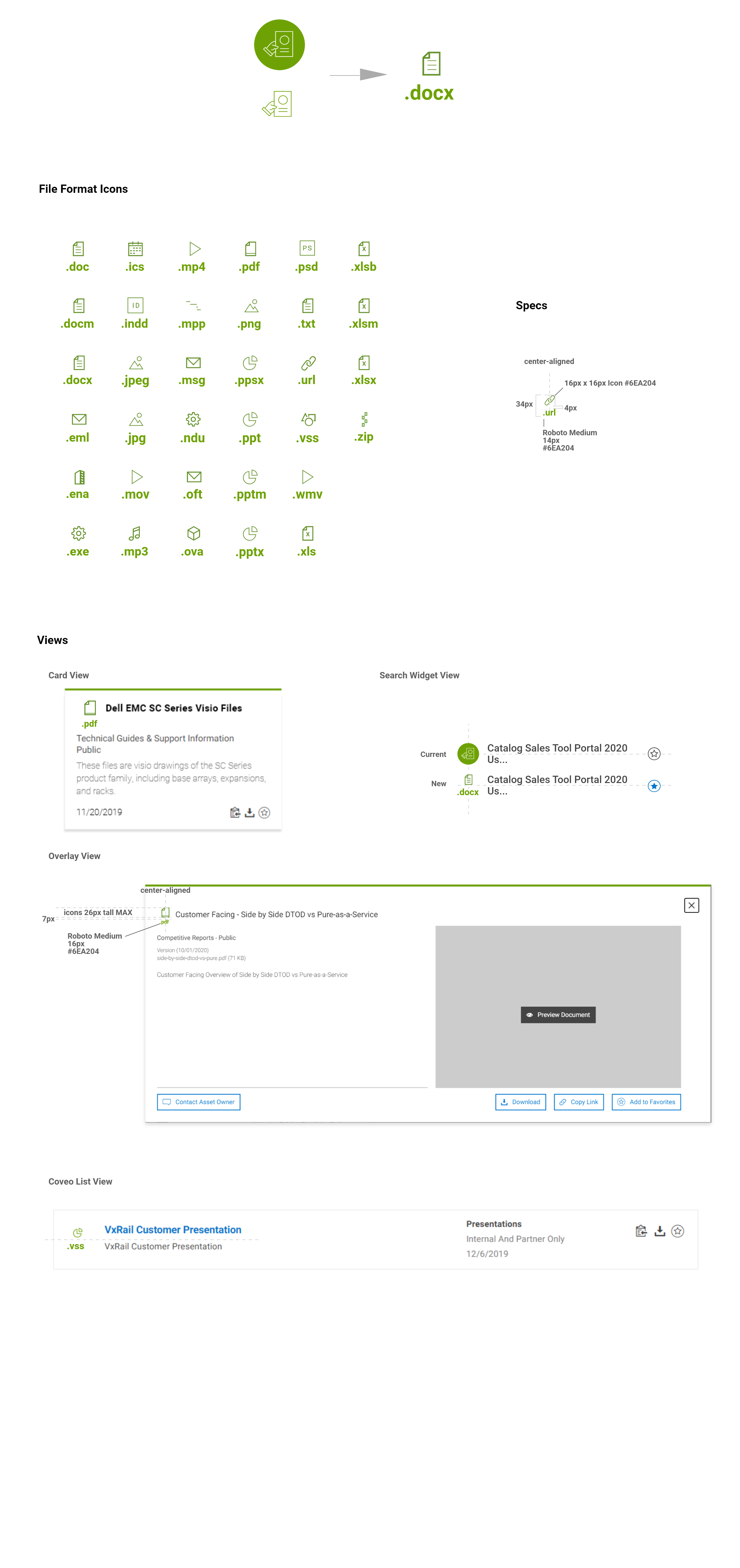 When I began working on the Sales Portal, the primary visual indicator signified the ‘asset category’ for that particular file. While the icon makes sense after reading the text it signifies, we were receiving feedback that we could do more to help our users easily scan and differentiate between the thousands of assets on our site. So I looked around for a few ways it was being handled by others, and somewhat predictably found that there was no magic bullet, and it came down to a compromise between text, iconography, & color -